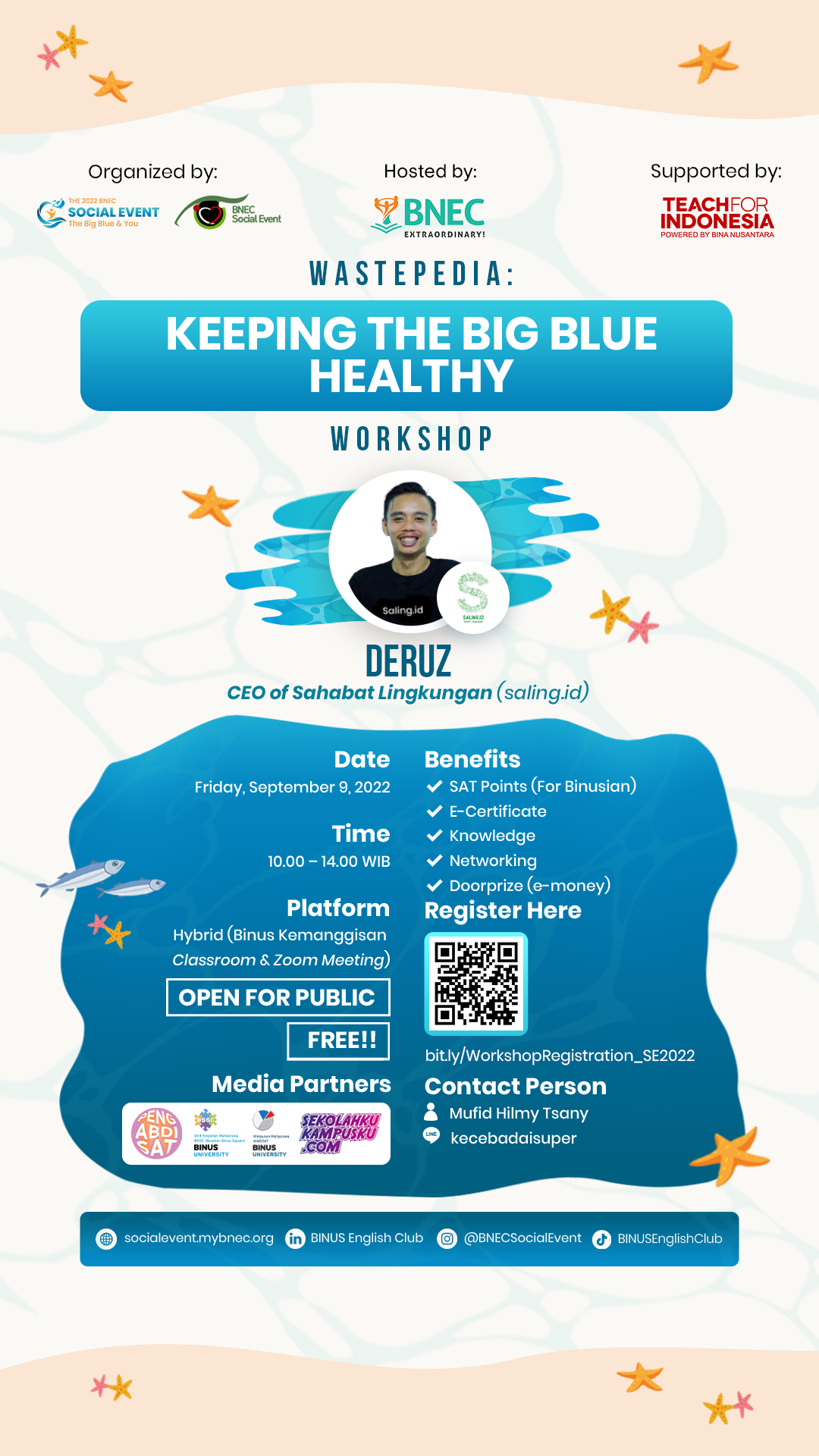Did you realize that our oceans are not healthy anymore? Most of the toxic materials found in the ocean come from plastic waste. It enters the oceans at a rate of more than 10 million tons annually, and it kills fish that are later consumed by humans. On this occasion, BNEC in collaboration with Saling.id will provide you with an interactive workshop to discuss the importance of keeping the ocean healthy.